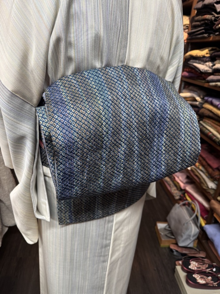 こちらは大島紬、渋めのカッコいいお着物ですね!帯は鹿子柄、良い柄ですね!✨💓💓😊