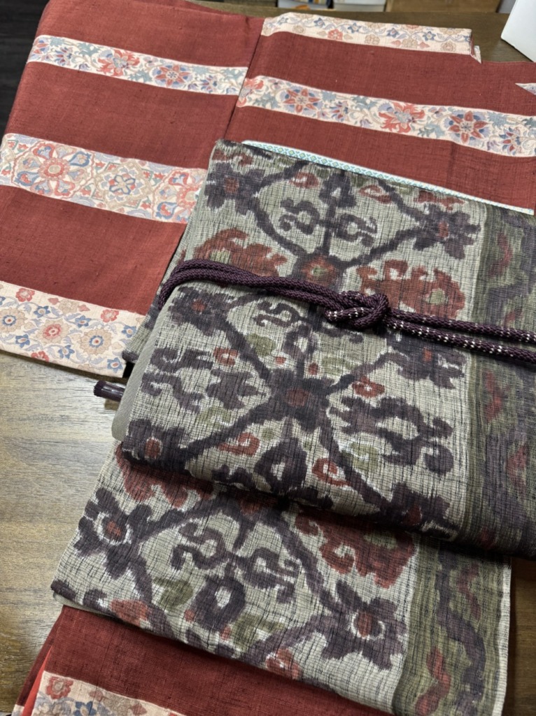入荷した紬、更紗柄の染め、地色の臙脂色も