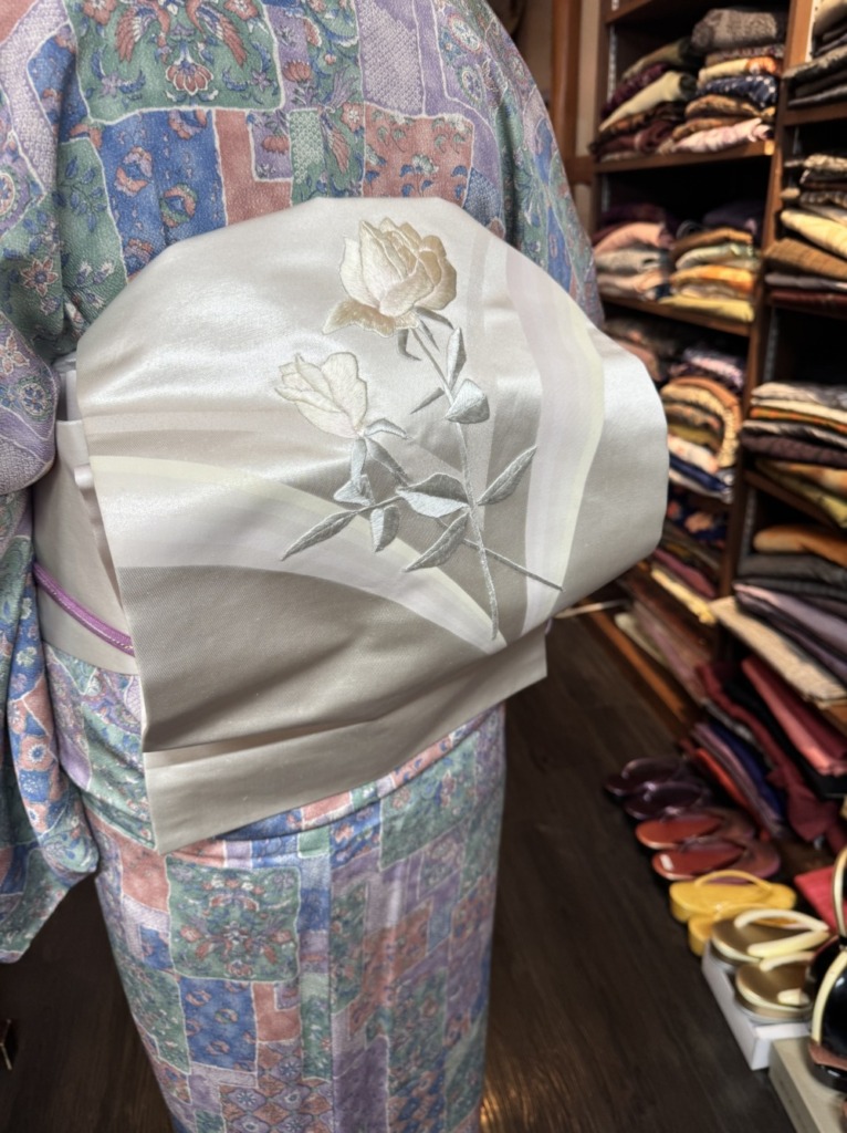 こちらの縮緬の更紗染、抑えた色目でとても綺麗ですね。帯は刺繍🌹です!