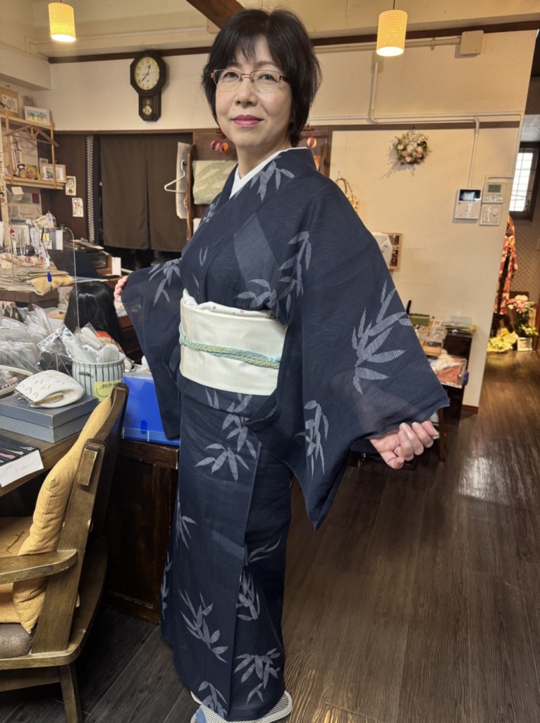 今日の着物浴は、夏物、絹紅梅、竺仙さんの着物です!藍色に笹紋様!涼しげ✨✨
